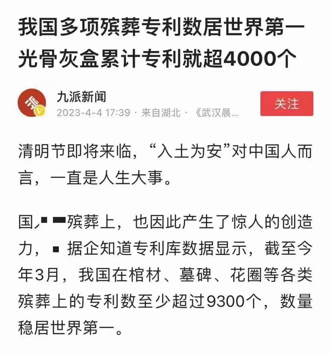 Theo Cơ sở dữ liệu bằng sáng chế, tính đến tháng 3 năm 2023, Trung Quốc có ít nhất 9.300 bằng sáng chế về quan tài, bia mộ, vòng hoa và các loại hình trong ngành tang lễ khác, “con số đứng đầu thế giới”.