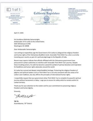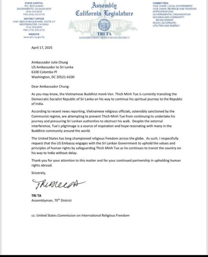 Cũng rạng sáng ngày 18 tháng 4 giờ Việt Nam, dân biểu Tạ Đức Trí tại bang California, Hoa Kỳ, đã gửi thư đến cho Tòa Đại sứ Mỹ, bà Julie Chung tại Sri Lanka và đến ông Đại sứ Sri Lanka tại Hoa Kỳ để trình bày diễn biến về tình hình. Thư cũng kêu gọi sự giúp đỡ cho hành trình tu tập của đoàn ông Thích Minh Tuệ.