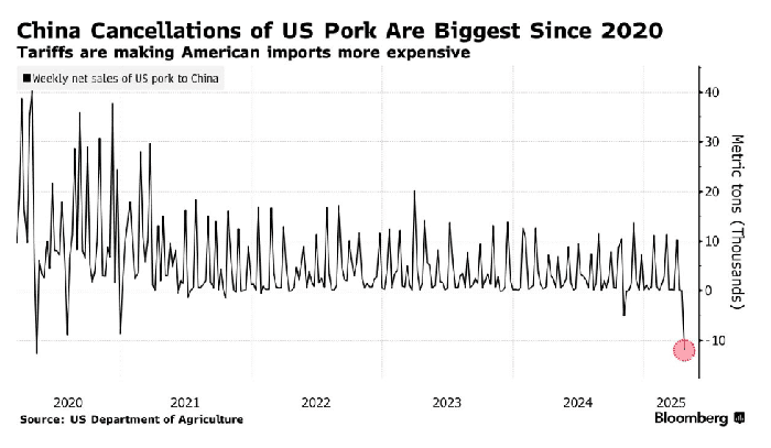 Số liệu của Bộ Nông nghiệp Hoa Kỳ (USDA) cho thấy thuế quan đang bắt đầu tác động tới xuất khẩu thịt của Hoa Kỳ khi số lượng đơn hàng thịt lợn bị hủy từ phía Trung Quốc cao nhất kể từ năm 2020.