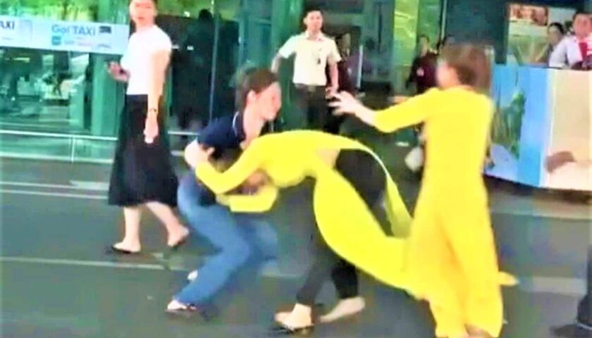 2 nữ nhân viên lao vào đánh nhau trước cửa ga đến của sân bay quốc tế Phú Quốc. (Ảnh cắt từ clip)