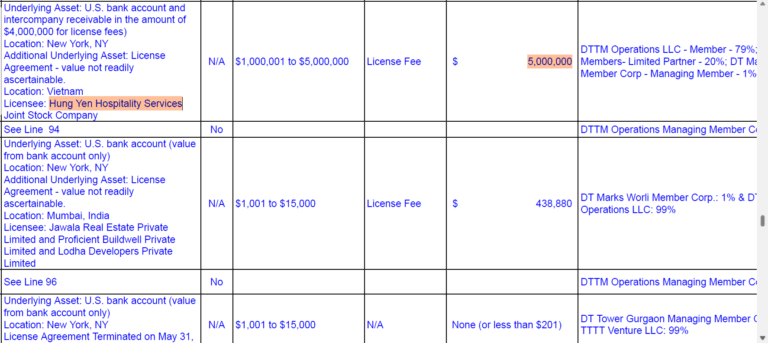 Một dự án sân golf và khu nghỉ dưỡng mang thương hiệu Trump ở miền Bắc Việt Nam được báo cáo đã thu về 5 triệu Mỹ kim cho gia đình Trump, trong đó 4 triệu Mỹ kim đã được chi trả, theo thông tin tiết lộ với Văn phòng Đạo đức Chính phủ Hoa Kỳ (US Office of Government Ethics). Xem nguồn: https://oge.app.box.com/s/k0hxcezgk7j1cyqoue16cillsi9srmfu