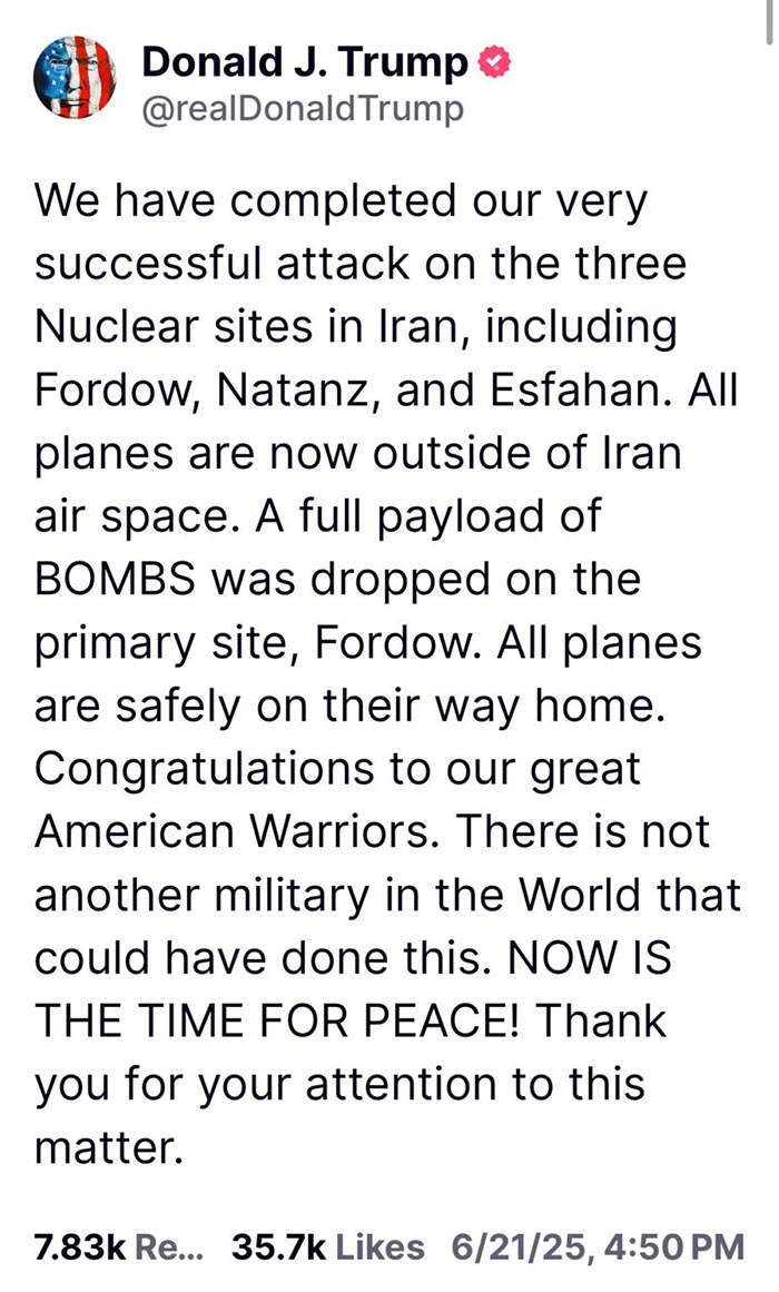 “Chúng ta vừa hoàn tất một cuộc tấn công hết sức thành công vào ba địa điểm hạt nhân tại Iran, bao gồm Fordow, Natanz và Esfahan. Tất cả máy bay hiện đã rời khỏi không phận Iran. Một lượng bom đầy đủ đã được thả xuống mục tiêu chính – Fordow. Tất cả máy bay đều đang trở về an toàn. Xin chúc mừng những Chiến binh Vĩ đại của nước Mỹ! Không có quân đội nào khác trên thế giới có thể làm được điều này. GIỜ LÀ LÚC CHO HÒA BÌNH! Cảm ơn quý vị đã quan tâm đến vấn đề này”.