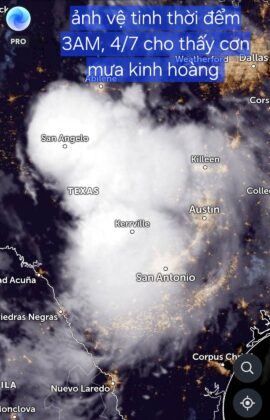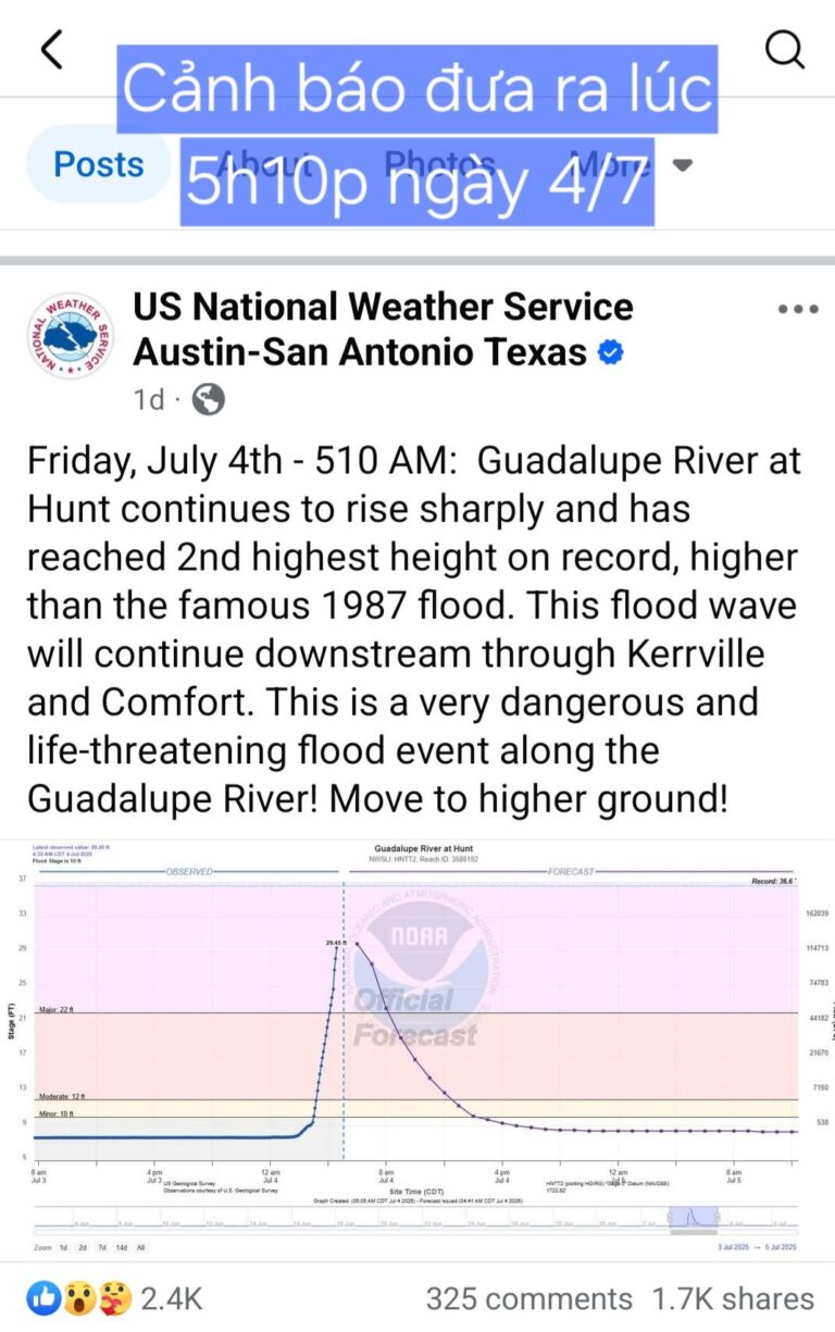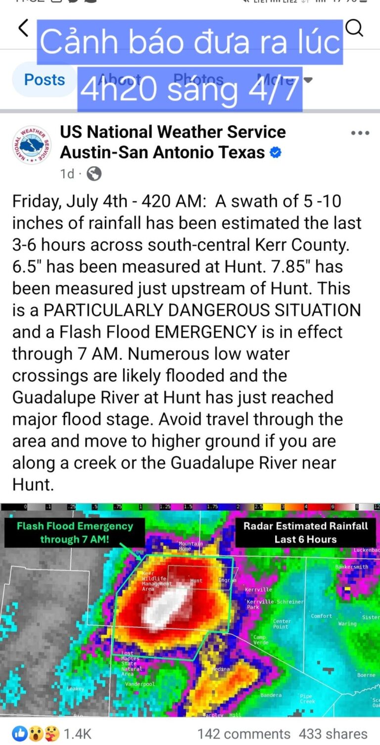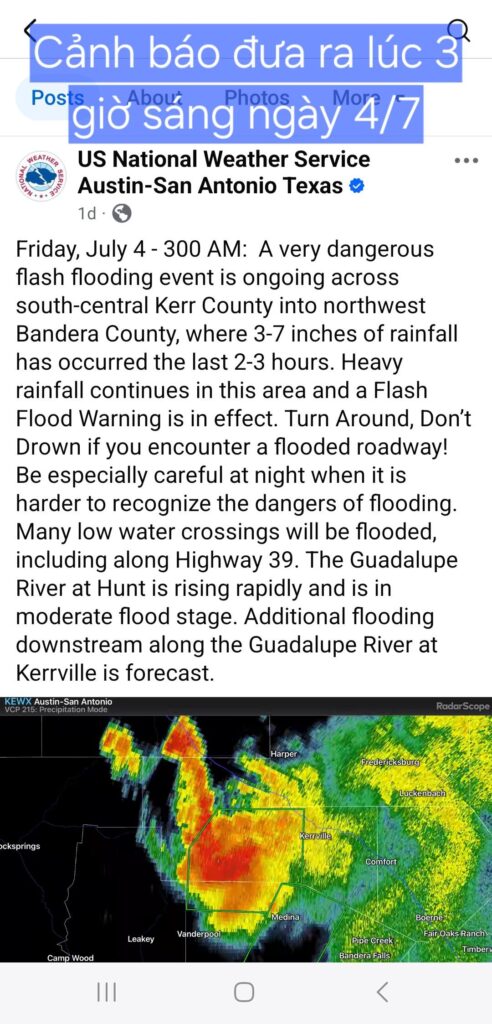 – Rạng sáng 4/7, vào lúc 5h10AM, cơ quan này đưa ra bản tin cảnh báo lụt trên sông Guadalupe lớn thứ 2 lịch sử. Lúc này nước đã tràn đập và lũ quét đã xảy ra trước đó.