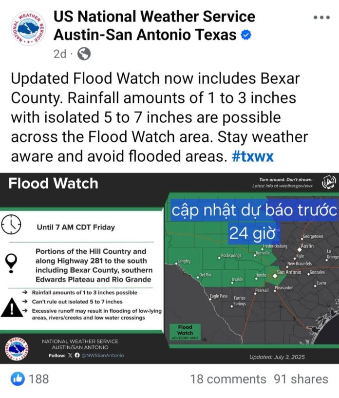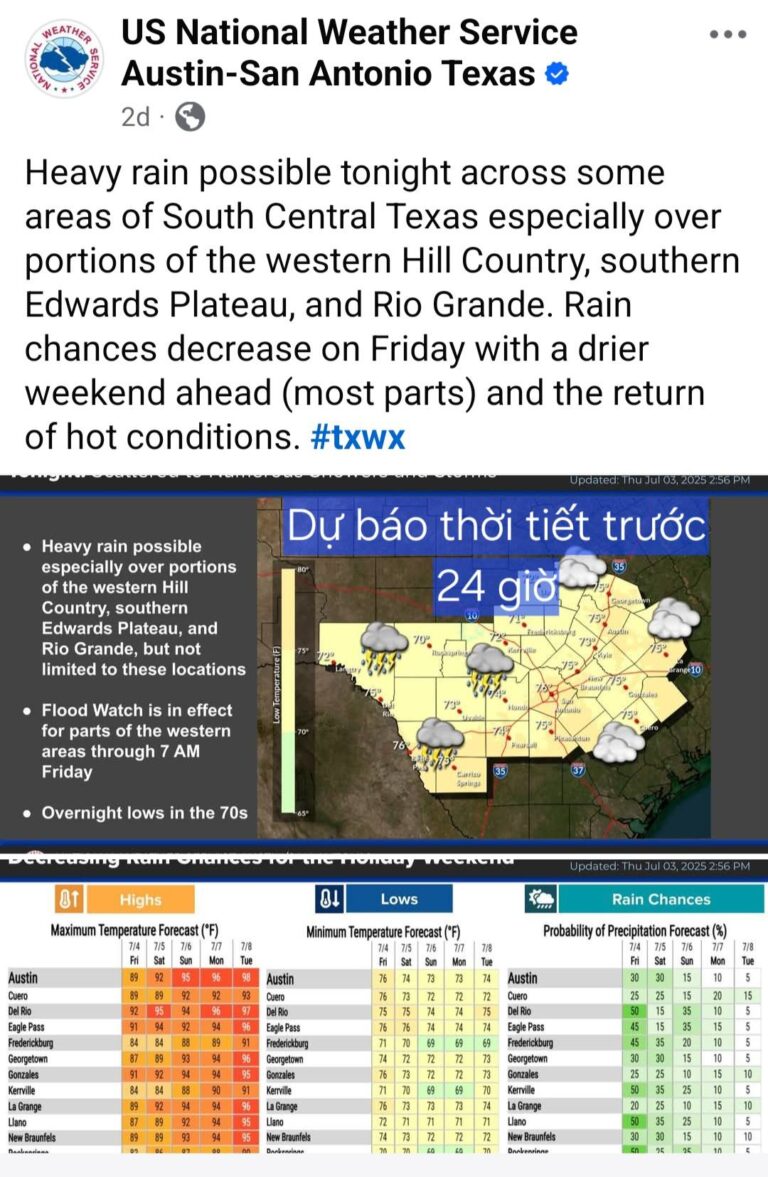 – Ngày 3/7 cơ quan này có dự báo mưa lớn sẽ xảy ra ở khu vực phía Nam, miền Trung Texas. Dự báo không chỉ rõ khu vực hạt Kerr. Không có cảnh báo lũ quét và hướng dẫn kèm theo.