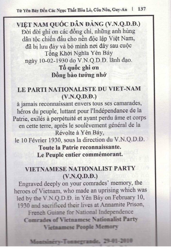 Năm 2010, một đoàn cựu tù nhân VNQDĐ, người già nhất đã 85 tuổi, quay về Guyane để tìm lại mộ và di tích của các đồng chí. Mồ hôi, nước mắt và xương máu của họ đã góp phần xây dựng vùng rừng thiêng nước độc đó thành một xứ phồn vinh như hôm nay.