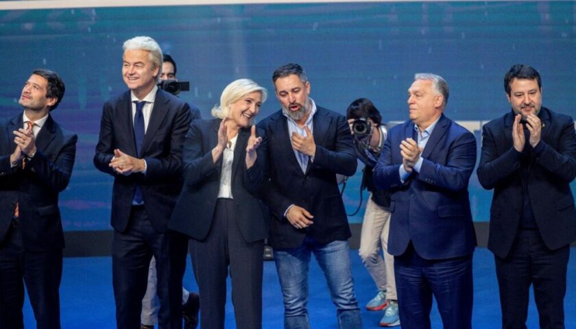 Từ trái sang phải: Lãnh đạo đảng chính trị cực hữu Chega của Bồ Đào Nha Andre Ventura; lãnh đạo cực hữu Hà Lan Geert Wilders; lãnh đạo cực hữu Pháp kiêm nghị sĩ quốc hội Marine Le Pen, Chủ tịch nhóm nghị sĩ đảng cực hữu Tập hợp Quốc gia (Rassemblement National – RN) của Pháp; lãnh đạo đảng cực hữu Vox của Tây Ban Nha Santiago Abascal; Thủ tướng Hungary Viktor Orbán và Phó Thủ tướng Ý Matteo Salvini đứng trên sân khấu tại cuộc biểu tình của đảng cực hữu VOX của Tây Ban Nha cùng với các nhà lãnh đạo cực hữu châu Âu khác, tại Madrid, Tây Ban Nha, ngày 8-2-2025. Nguồn: Eropa Press/ ABACA