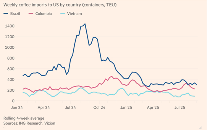 Trong tháng 8/2025, nhập khẩu cà phê từ Brazil giảm tới hơn 75% so với cùng kỳ năm 2024. Các nước sản xuất lớn khác như Việt Nam và Colombia cũng không thể cung cấp đủ để bù đắp sự thiếu hụt này.