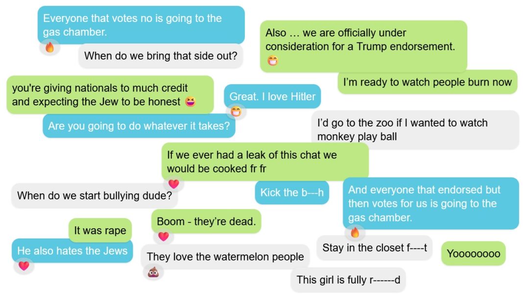 Trong các cuộc trò chuyện chính thức về việc bỏ phiếu bất lợi, chiến lược mạng xã hội và hậu cần, các thành viên trong cuộc trò chuyện đã sử dụng một loạt từ ngữ miệt thị — mà POLITICO đang đăng lại để cho thấy cách họ nói. Những từ ngữ như “f—-t”, “retarded” và “n–ga” đã xuất hiện tổng cộng hơn 251 lần.