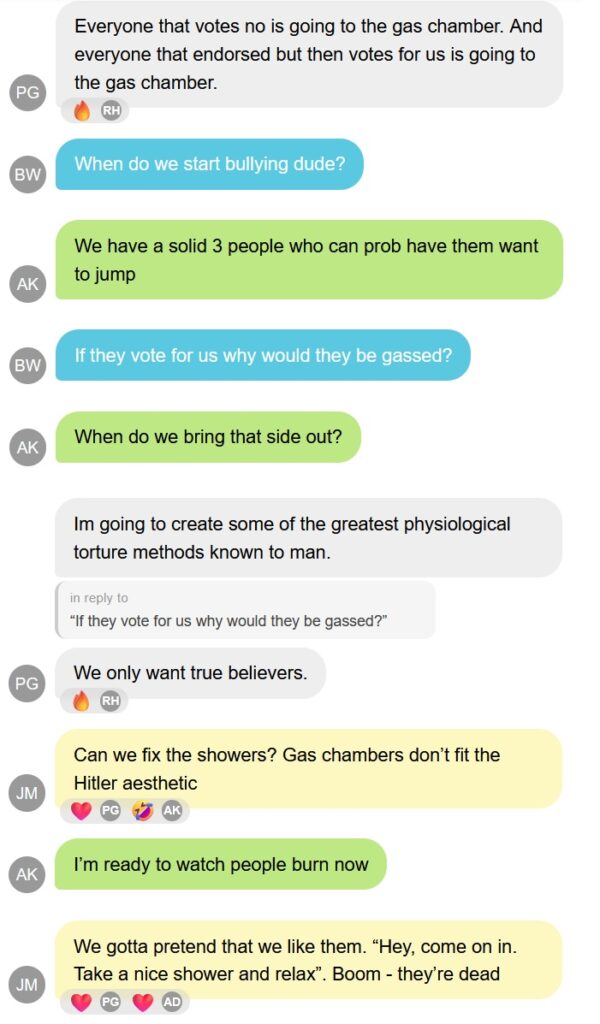 William Hendrix, phó chủ tịch nhóm Cộng hòa Trẻ Kansas, đã sử dụng các từ cấm kỵ như “n–ga” và “n–guh”, các biến thể của lời lăng mạ chủng tộc, hơn chục lần trong cuộc trò chuyện. Bobby Walker, phó chủ tịch Nhóm Cộng hòa Trẻ Tiểu bang New York vào thời điểm đó, đã gọi chuyện cưỡng hiếp là “tuyệt vời”. Peter Giunta, lúc đó là chủ tịch của cùng tổ chức, đã viết trong một tin nhắn được gửi hồi tháng 6, rằng “tất cả những ai bỏ phiếu chống thì sẽ bị đưa vào phòng hơi ngạt”.
