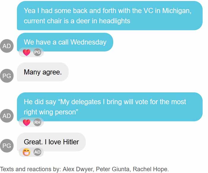 Trong một cuộc trao đổi khác, Dwyer, chủ tịch Kansas, thông báo với Giunta rằng, một trong những thành viên Đảng Cộng hòa Trẻ Michigan hứa với ông rằng, nhóm “sẽ bỏ phiếu cho người có khuynh hướng cánh hữu nhất” để lãnh đạo tổ chức quốc gia.