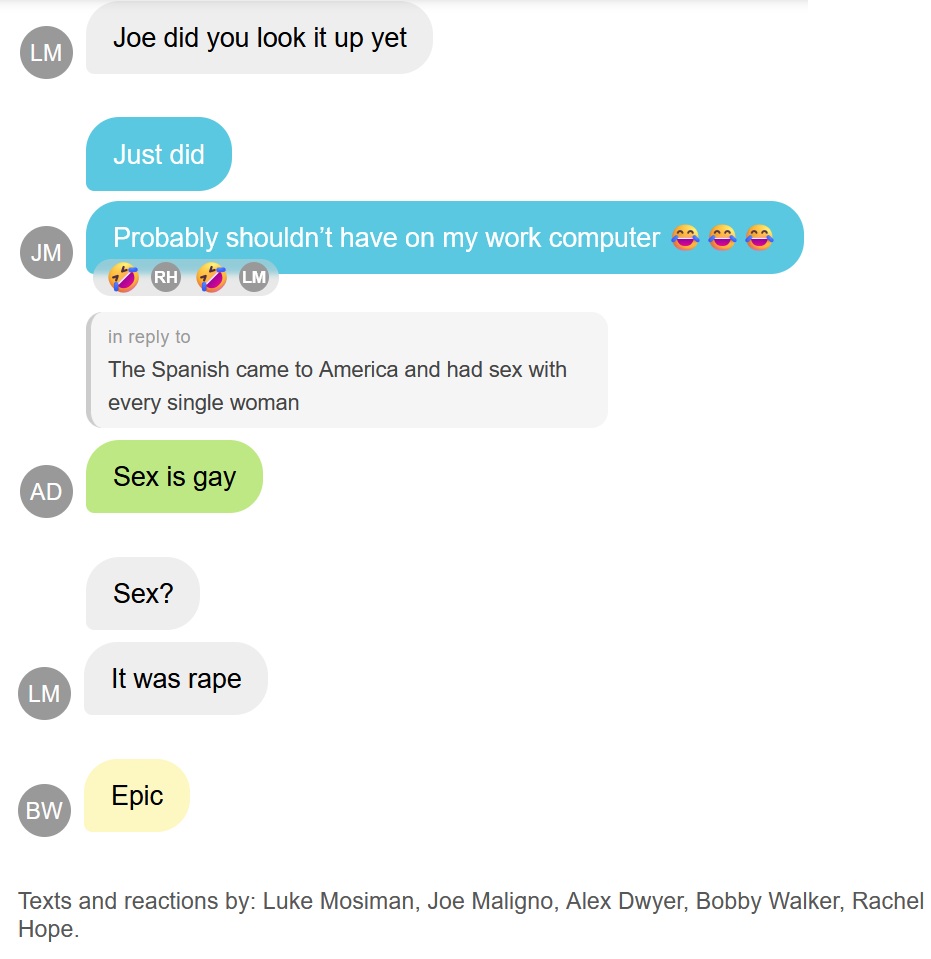 “Vậy ý anh là cái thằng Hayden đồng tính tự viết nghị quyết à?” (Nguyên văn: F—-t, tức chữ Faggot). Giunta hỏi nhóm về chủ tịch Liên đoàn Quốc gia Cộng hòa Trẻ hồi cuối tháng Năm.