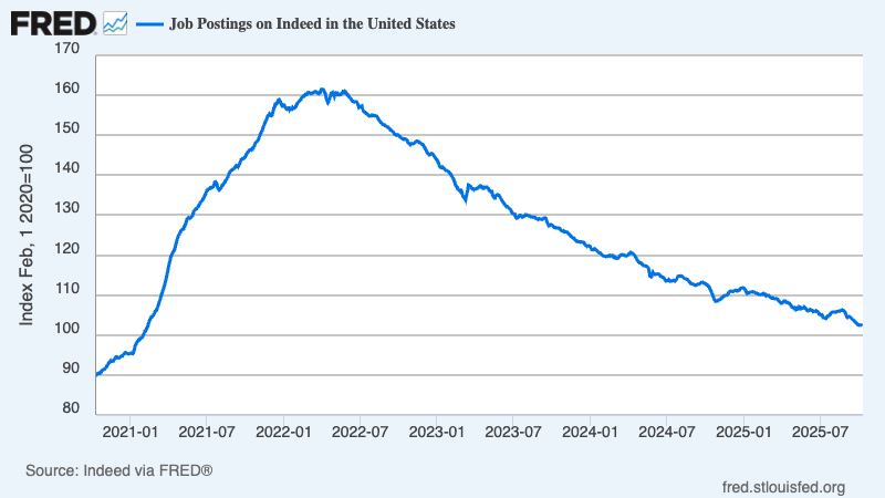 Những dữ liệu này hiện không được cập nhật do chính phủ đóng cửa, nhưng chúng ta có được bức tranh cập nhật hơn từ các nguồn riêng tư, chẳng hạn như các bài đăng tuyển dụng trên Indeed.com, chúng cho thấy bức tranh đang trở nên tồi tệ hơn: