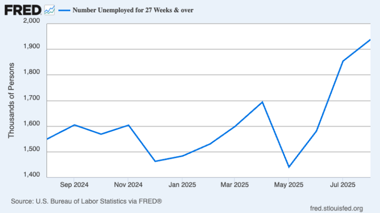 Và họ đã đúng. Tỷ lệ thất nghiệp nói chung không tăng nhiều, nhưng số người thất nghiệp dài hạn — những người lao động tiềm năng thất nghiệp hơn 6 tháng — đã tăng vọt, tính đến tháng 8 và có thể tiếp tục tăng kể từ đó: