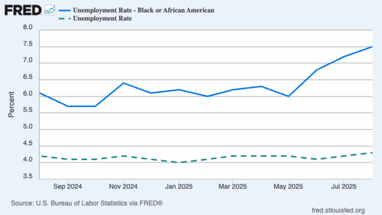 Một chỉ báo quan trọng khác về tình hình lao động đang gặp khó khăn là sự thất nghiệp của người da đen. Sau ngần ấy năm, người lao động da đen vẫn có xu hướng “được tuyển dụng sau cùng, nhưng bị sa thải trước nhất”. Và trong khi tỷ lệ thất nghiệp chung (đường nét đứt màu xanh lá cây) cho đến nay vẫn chưa tăng nhiều, thì tỷ lệ thất nghiệp của người da đen (đường nét xanh lam) lại tăng vọt, có lẽ là do người lao động da đen đang gặp khó khăn đặc biệt trong việc tìm việc làm trong nền kinh tế đóng băng này: