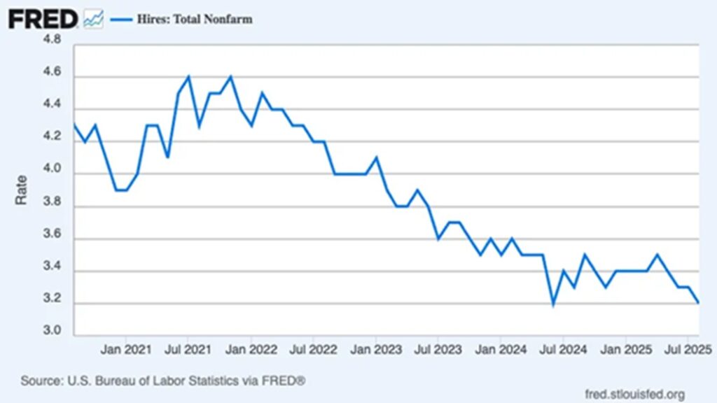 Đầu tiên, như tôi đã nói, chúng ta chưa chứng kiến các đợt sa thải hàng loạt — ngoại trừ từ chính phủ liên bang! — nhưng tốc độ tuyển dụng của các doanh nghiệp đang rất thấp so với tiêu chuẩn lịch sử, không quá xa so với mức trong cuộc khủng hoảng tài chính 2008-2009: