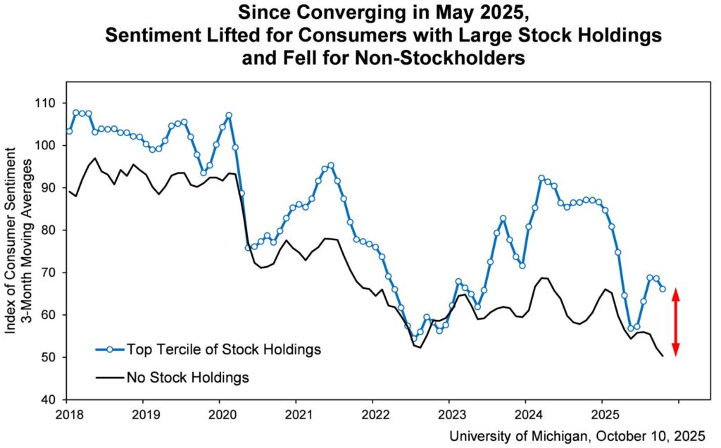 Và rồi còn thị trường chứng khoán. Các nhà đầu tư dường như quyết định rằng những điều kỳ diệu của AI quan trọng hơn cơn sốt thuế quan của Trump, vì vậy chúng ta đang chứng kiến sự tăng vọt của thị trường chứng khoán do các công ty công nghệ thống trị. Bên cạnh câu hỏi, liệu đây có phải là bong bóng hay không, điều quan trọng cần lưu ý là 10% hộ gia đình giàu nhất sở hữu 87% cổ phiếu, trong khi 50% người nghèo nhất gần như không sở hữu cổ phiếu nào và không được hưởng lợi gì từ thị trường tăng giá. Do đó, biểu đồ sau đây, được Michigan Consumer Survey nêu bật: