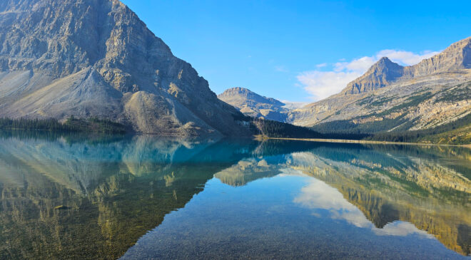 Sáng hôm sau, chúng tôi được đưa đi trên cung đường được mệnh danh là một trong những tuyến đường đẹp nhất thế giới: nơi có thác nước đổ từ vách đá dựng đứng, hồ xanh ngọc nằm giữa thung lũng bao la, và những dòng sông băng cổ xưa như Peyto Lake, Crowfoot Glacier, Bow Summit và Bow Lake.
