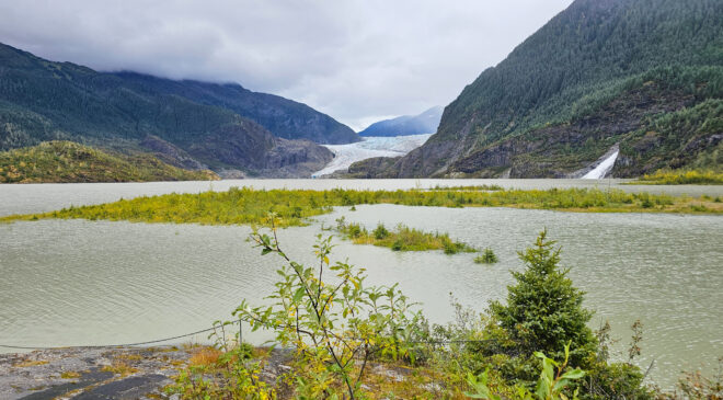 Tại Juneau, chúng tôi khám phá Mendenhall Glacier – một kỳ quan thiên nhiên nổi bật của Alaska. Chuyến xe đưa chúng tôi xuyên qua khu rừng Tongass đến trung tâm du khách, rồi đi bộ đến thác Nugget Falls, ngắm mặt hồ phẳng lặng phản chiếu khối băng khổng lồ. Mendenhall Garden cũng là một điểm dừng chân đầy thi vị, với những luống hoa rực rỡ và lối đi lát đá uốn lượn giữa cây cối xanh tươi.