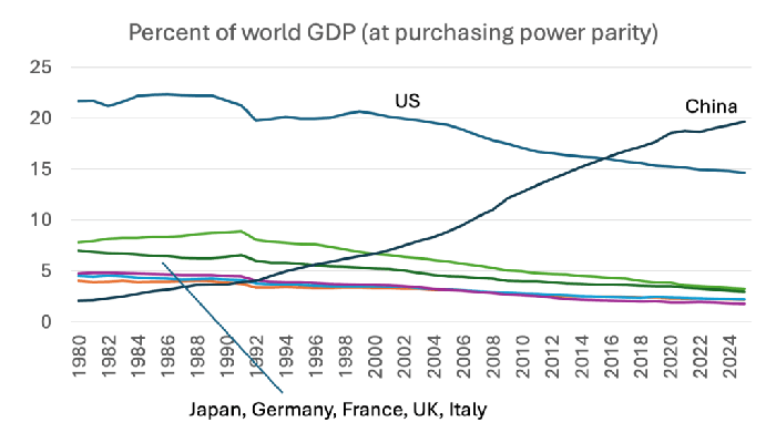 Nhưng sự trỗi dậy của Trung Quốc đã tạo ra những vấn đề địa chính trị. Cho đến thập niên 1980, tất cả các nền kinh tế lớn nhất thế giới đều là các nền dân chủ, liên minh với Hoa Kỳ thông qua các hiệp ước chính thức và các giá trị chính trị chung. Các nền dân chủ vẫn thống trị nền kinh tế thế giới trong những năm đầu thế kỷ 21. Nhưng giờ đây, nền kinh tế Trung Quốc, được đo bằng lượng hàng hóa và dịch vụ thực tế mà nước này sản xuất, đã lớn hơn nền kinh tế Mỹ và lớn hơn nhiều so với bất kỳ nước nào khác: