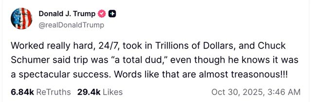 Donald J. TrumpLàm việc rất chăm chỉ, 24/7, thu về hàng ngàn tỷ đô la, vậy mà Chuck Schumer lại nói chuyến đi “hoàn toàn thất bại”, mặc dù ông biết đó là một thành công vang dội. Nói như vậy gần như là phản quốc!!!