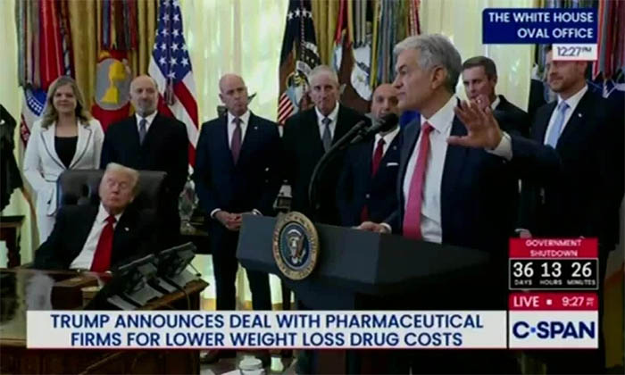 Tổng thống Mỹ Donald Trump tham gia sự kiện thông báo cắt giảm giá thuốc giảm cân ở Phòng Bầu dục tại Nhà Trắng ngày 6/11. Ông ngồi trong ghế bành tại Bàn Kiên định, xung quanh là các quan chức chính quyền.