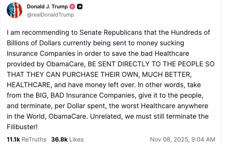 “Tôi đề nghị với các Thượng nghị sĩ Đảng Cộng hòa rằng hàng trăm tỷ đô la hiện đang được gửi đến các công ty bảo hiểm hút tiền, để cứu vãn hệ thống chăm sóc sức khỏe kém cỏi do ObamaCare cung cấp, HÃY GỬI TRỰC TIẾP ĐẾN NGƯỜI DÂN ĐỂ HỌ CÓ THỂ TỰ MUA BẢO HIỂM CHO CHÍNH HỌ, BẢO HIỂM TỐT HƠN NHIỀU, và vẫn còn dư tiền. Nói cách khác, hãy lấy từ các công ty bảo hiểm LỚN, TỆ HẠI, đưa cho người dân, và chấm dứt, tính trên mỗi đô la chi tiêu, ObamaCare là hệ thống chăm sóc sức khỏe tệ hại nhất trên thế giới. Chủ đề khác không liên quan, chúng ta vẫn phải chấm dứt Filibuster!”