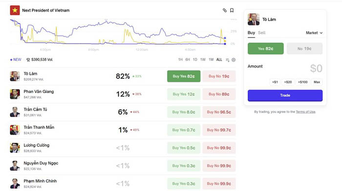 Ảnh chụp màn hình kết quả ở thị trường cá cược chức Tổng Bí thư trên Polymarket