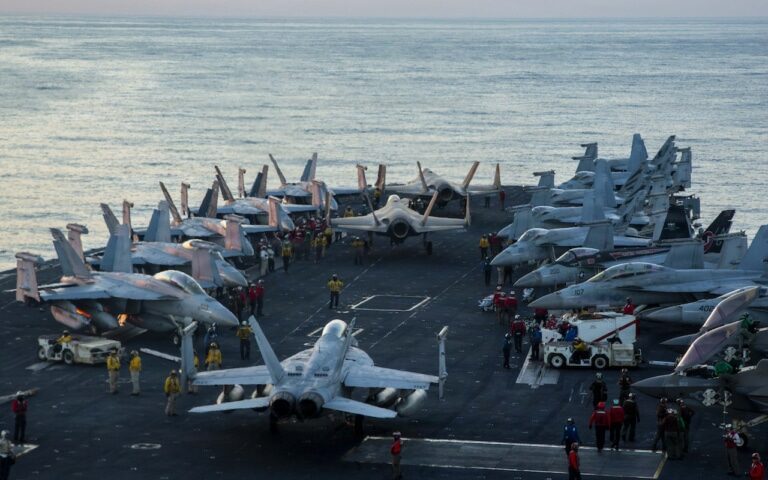 Ngày 28/2/2026, các thủy thủ Hải quân Mỹ đã hướng dẫn máy bay đến điểm tập kết trên boong tàu sân bay USS Abraham Lincoln (CVN 72) để hỗ trợ Chiến dịch Cơn thịnh nộ sử thi. (Ảnh: Hải quân Hoa Kỳ)