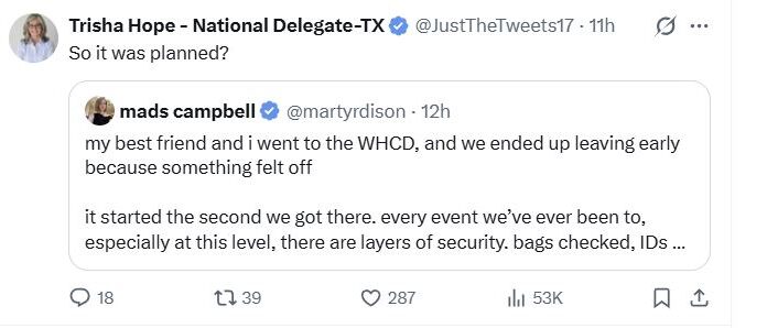 Cụ thể là bà Trisha Hope (Đại biểu Quốc gia từ Texas), người đã công khai chất vấn về vụ ám sát hụt hồi mùa hè 2024. Bà Trisa Hope dẫn lại bài đăng của Mads Campbell là người có mặt tại hiện trường và rời đi sớm với bình luận như sau: “Hóa ra việc này đã được lên kế hoạch từ trước sao?“