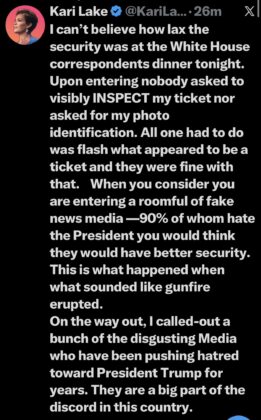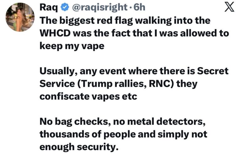 “Tôi và người bạn thân nhất của mình đã đi dự Tiệc tối của Hiệp hội Phóng viên Nhà Trắng (WHCD), và chúng tôi đã quyết định rời đi sớm vì cảm thấy có gì đó không ổn.