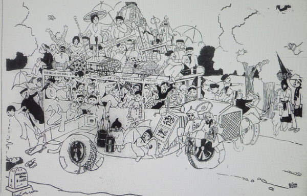 Chắc các bạn còn nhớ: Bắt đầu từ Phong Hóa số 14, ra ngày 2 tháng 9-1932 chủ bút mới là Nguyễn Tường Tam. Cùng em là Hoàng Đạo Nguyễn Tường Long và các bạn như Tú Mỡ Hồ Trọng Hiếu, Khái Hưng Trần Khánh Giư …mới phụ trách tờ Phong Hóa. Ngay trong số 14 này, ta bắt gặp Đông Sơn đưa hình cụ (chưa có tên) về Hà Nội trên một chuyến xe đò đông như nêm cối (hình dưới). Các bạn có nhìn thấy cụ ngồi trên mui xe ngay trên đầu tài xế đó không? Họa sĩ Đông Sơn thật hóm, giấu kỹ chẳng cho ai biết tin gì cả! Nhưng lòi đuôi! Tuy nhiên, rất có thể chính ông cũng không biết là mình đã cho cụ về thành hôm đó, trên chiếc xe đò đó! (Mà này, nhỡ ông vẽ mà không biết là có cụ trốn trên mui đó thì oan cho ông nhỉ!?)