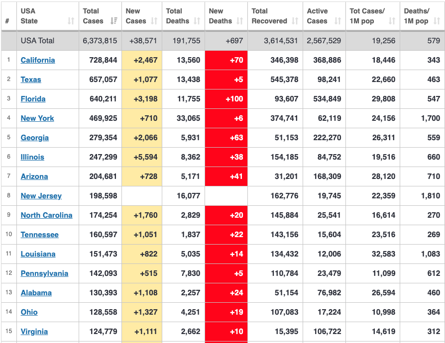 *  Cali đã leo lên hàng đầu với 730.000 người bị nhiễm và hơn 13.500 người chết, tiếp theo là Texas, Florida và New York. Tính về tỷ lệ tử vong thì Cali và Texas vẫn trong khối ít người chết nhất.