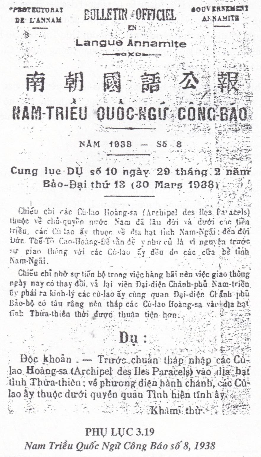 “Chính quyền Quốc Dân Đảng đã nghiên cứu và xác định tên tiếng Trung Hoa và tiếng Anh cho toàn bộ các đảo, vỉa đá Trung Hoa trên biển phía nam Trung Hoa vào tháng 12/1934 và tập hợp chúng lại thành bốn quần đảo lần đầu tiên. Một bản đồ ấn hành vào tháng 4-1935 cho thấy chi tiết các đảo của Trung Hoa trên biển phía nam Trung Hoa, đánh dấu mũi cực nam của biển phía nam Trung Hoa là Zengmu’ansha ở vĩ độ 4 độ Bắc chí tuyến. Một bản đồ khác, ấn hành tháng 2/1948 cho thấy, sự phân chia hành chính của Trung Hoa Dân Quốc. Bản đồ còn cho thấy đường nối dài 11 điểm bao quanh bốn quần đảo với mũi cực nam ở Zengmu’ansha. Đây là bản đồ đầu tiên đánh dấu biên giới hình chữ U của Trung Hoa trên biển phía nam Trung Hoa. Các bản đồ ấn hành sau khi Cộng Hòa Nhân Dân Trung Hoa thành lập [1949] đã giữ lại đường nối dài 11 điểm, và cho tới năm 1953, thì hai điểm đánh dấu Vịnh Bắc Việt bị xóa bỏ. Sau đó, tất cả bản đồ Trung Hoa đều theo đường nối dài chín điểm, hình chữ U.” (Internet: China Daily ngày 22-7-2011, trang 9.)