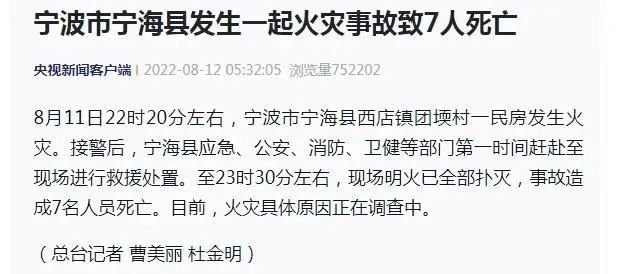 Vào ngày 12/8, CCTV cho biết khoảng 22 giờ 20 phút tối ngày 11/8, một vụ hỏa hoạn đã bùng phát tại một ngôi nhà riêng ở thị trấn Tây An , huyện Ninh Hải thành phố Ninh Ba.
