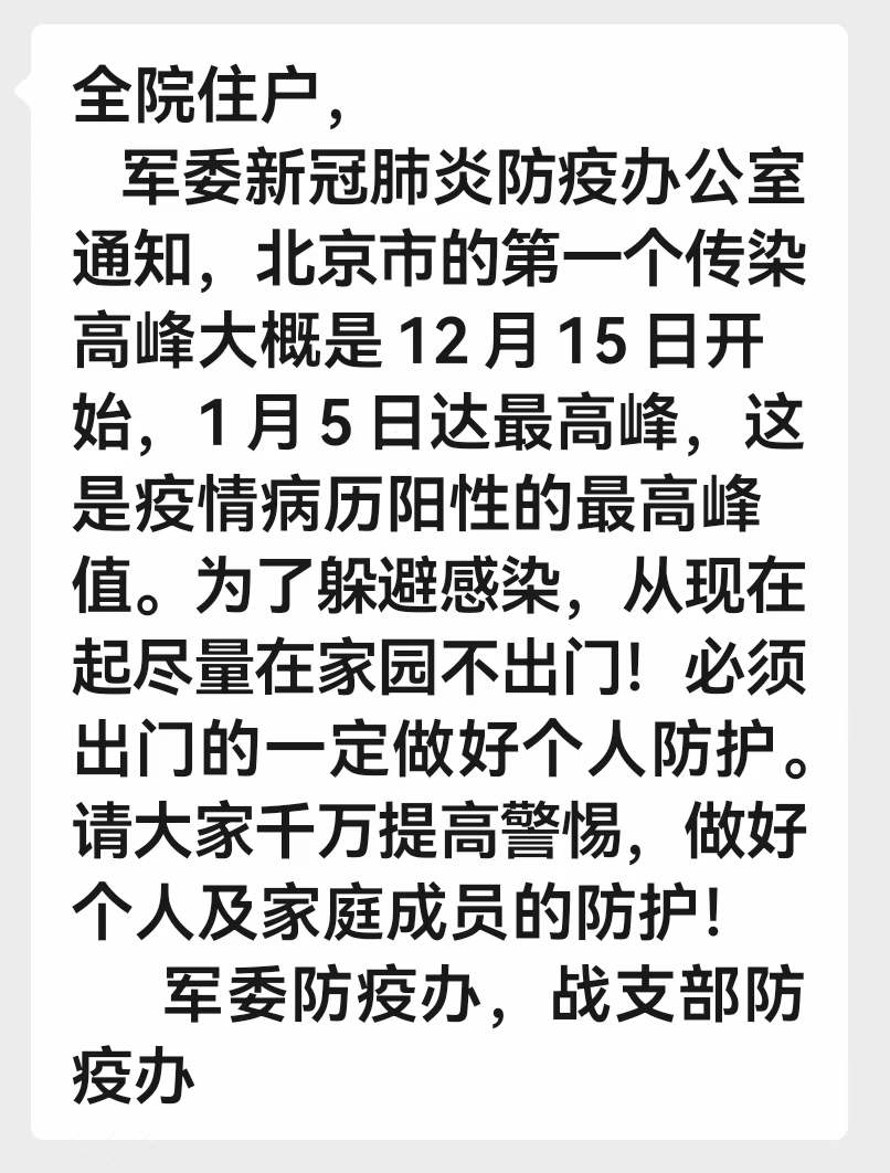 Vào ngày 8 tháng 12, một khu liên hợp quân sự ở Bắc Kinh đã đưa ra thông báo cho biết, đợt lây nhiễm đầu tiên ở Bắc Kinh có thể bắt đầu vào ngày 15 tháng 12 và đạt đỉnh vào ngày 5 tháng 1. Để tránh lây nhiễm, từ giờ người dân cố gắng càng hạn chế không ra khỏi nhà càng tốt.