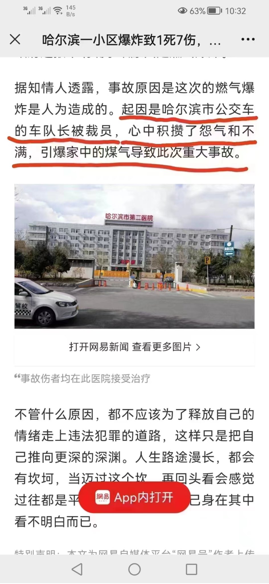 Theo báo cáo của các phương tiện truyền thông chính thức của TQ vào ngày 28 tháng 3, thông báo chính thức của quận Đạo Ngoại về sự cố nổ khí đốt Cáp Nhĩ Tân là do một người đàn ông đã cắt đường ống dẫn khí và cố tình xả khí để tự sát. Vào lúc 17:13 ngày 25 tháng 3 năm 2023, một vụ nổ gas đã xảy ra tại một tòa nhà dân cư ở tầng 1 của tòa nhà số 45, đường Thái Bình Bắc Tam Đạo, quận Đạo Ngoại. Vào lúc 17:33 cùng ngày, đám cháy đã được dập tắt, diện tích bị cháy khoảng 60m2, 1 người chết và 7 bị thương nhẹ, sau khi được bệnh viện khám và điều trị đã lần lượt trở về nhà.