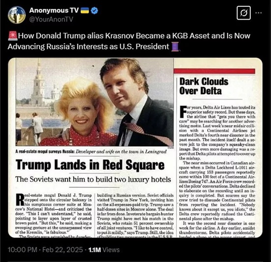 Trần Gia Huấn 15-3-2025 Quan hệ mờ ám giữa Trump và Putin là chủ đề của nhiều đồn đoán từ lâu. Các cựu điệp viên KGB đưa ra bằng chứng: Trump được KGB tuyển dụng từ 1987, khi Trump 40 tuổi, mang biệt danh Krasnov, hình thức hoạt động là “chủ động cấp chiến lược”, dưới sự lãnh đạo của Putin.…