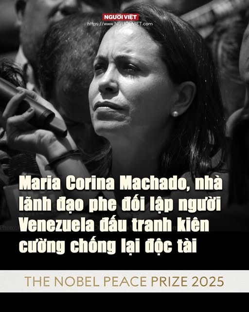 Hoàng Quốc Dũng (Người-Việt): Giải Nobel Hòa Bình 2025 thuộc về nhà lãnh đạo phe đối lập Venezuela, bà Maria Corina Machado, vì sự đấu tranh kiên cường chống lại độc tài. Ủy Ban Nobel Na Uy, công bố vào 5 giờ sáng (giờ miền Đông Hoa Kỳ) ngày Thứ Sáu 10 Tháng Mười. “Giải Nobel Hòa bình năm 2025…