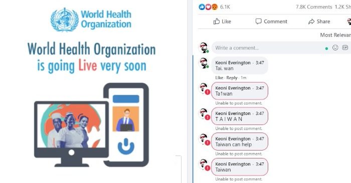 Hải Lam Trong khi Đại hội đồng Y tế Thế giới (WHA) tiếp tục phiên họp thứ 73, vào sáng thứ Năm (12/11), nhà lập pháp Đài Loan Trần Bách Duy phát hiện rằng từ “Đài Loan” đã bị chặn trong phần bình luận bên dưới video phát trực tuyến của Facebook về cuộc họp. Khi gõ từ “Taiwan” (Đài…